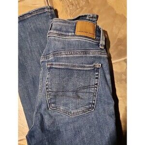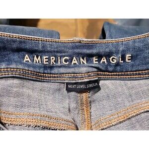 These Neptune Blue American Eagle Next Level Stretch Kick-Boot Jeans are a stylish and comfortable choice for juniors. The jeans are size 00 with a waist size of 26 inches and inseam of 29 inches, featuring a low rise and medium wash fabric. They have a traditional 5-pocket design with a zip and button closure, adorned with button and zipper accents and the American Eagle logo. The boot cut style and stretch fabric offer a trendy and flattering fit for everyday wear.
