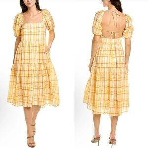 New ASTR The Label Ilana Plaid Puff Sleeve Tie Open Back Tiered Midi Dress
