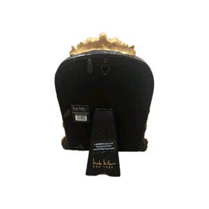 The product is a Nicole Miller black and gold boho floral Hollywood regency picture frame, featuring a Victorian pattern and a happy character. Made of resin, this 5x7 frame is designed for all occasions and has a retro style with clear glass for photo display. The free-standing frame stands at 9 inches tall and is manufactured in China. Perfect for adding a touch of boho flair to your home decor, this frame is both stylish and elegant.