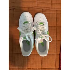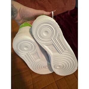 Step into a fresh take on a timeless classic with these brand new Nike Air Force 1 '07 sneakers. Featuring a crisp white leather upper accented by vibrant neon green (sometimes referred to as Volt) on the iconic Swoosh, heel tab, and tongue tag. These women's size 8 shoes offer the signature Air cushioning for all-day comfort and style.
