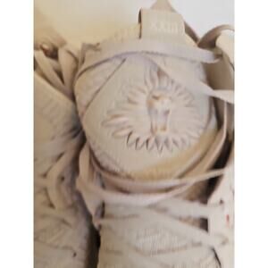 The product is a Nike LeBron XVII 17 sneaker in Men's size 10 (UK size 9). It features a lace-up closure and pull-on style, with a silhouette based on the Nike LeBron XVII 17 PRM “Harlem Fashion Row” design. The shoe is designed for activewear and casual occasions, with features like cushioning, slip resistance, limited edition design, and moisture-wicking properties. The outsole is made of rubber, and the upper material is Knitposite. The color scheme includes Desert Sand/Metallic Gold, and the shoe is part of the Nike LeBron product line.