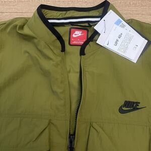 The product is a new Nike men's medium green tech woven utility nylon vest with a full zip. This stylish windbreaker is designed for outdoor use, featuring a solid green color and a durable nylon outer shell material. The regular fit and medium size make it a comfortable and practical choice for active individuals looking for a versatile and high-quality outerwear option.