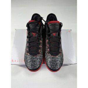 Details: Low-top lace-up design, padded collar and tongue, LeBron branding on tongue and heel, patterned overlay upper, contrast white midsole with black and red detailing.