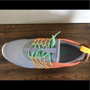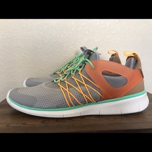 The Nike Free Viritous helps keep your foot cool, comfortable and moving naturally with breathable mesh and light weight flexible cushioning. Bootie construction. Color is wolf grey, green glow, laser orange.