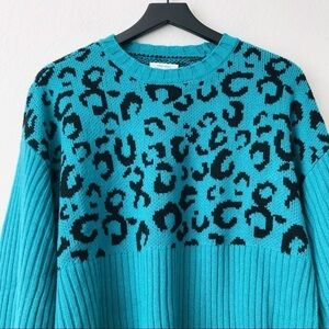 New! Nine West Leopard Cheetah Chunky Knit Ribbed Teal Black Crewneck Sweater