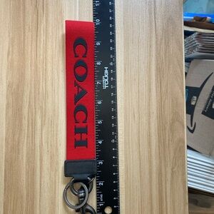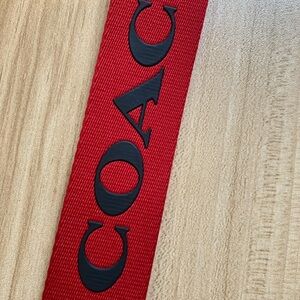 This stylish Coach accessory combines functionality with a bold design, featuring a vibrant red strap with black text and hardware. The durable woven material and secure swivel hook make it perfect for keeping your keys and cards organized and easily accessible. Elevate your everyday essentials with this chic and practical key and card holder.