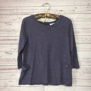 Brand new, never worn, no tags. Nordstrom Caslon merino wool back zip patch pocket relaxed boxy knit sweater top. Merino wool blend pullover sweater with fully exposed back zip closure, two small patch pockets with metal ring details, exposed middle seam down front. Modeled photo is not exact sweater but demonstrates style. 3/4 length sleeves. Gray marled color. Perfect transition piece or layering piece. Extremely soft. Size XS petite. Box H.