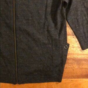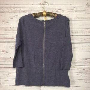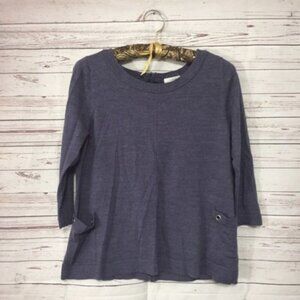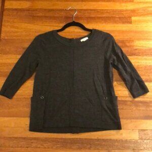 Brand new, never worn, no tags. Nordstrom Caslon merino wool back zip patch pocket relaxed boxy knit sweater top. Merino wool blend pullover sweater with fully exposed back zip closure, two small patch pockets with metal ring details, exposed middle seam down front. Modeled photo is not exact sweater but demonstrates style. 3/4 length sleeves. Gray marled color. Perfect transition piece or layering piece. Extremely soft. Size XS petite. H.