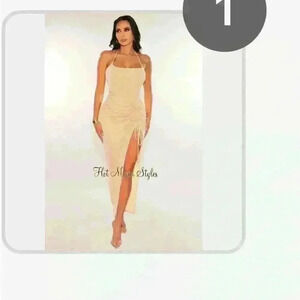 New Nude Ribbed Shimmery Halter Drawstring Slit Maxi Dress.