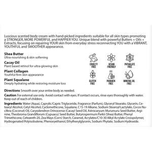 Luscious scented body cream with hand-picked ingredients, suitable for all skin types, promoting a stronger, more powerful, and happier you. Unique blend with powerful butters, oils, and extracts, focusing on repairing your skin from everyday stress, reconnecting you with a vibrant, youthful, and smoother appearance!