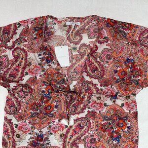 New ONDADEMAR Medium 100% Cotton Floral Paisley Resortwear Deep-V Top/Blouse
