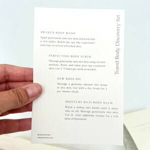 • Includes: Awaken Body Wash (2.5 oz), Perfecting Body Scrub (1.4 oz), Dew Body Oil (1 oz), Luminous Body Lotion (1.35 oz), Moisture Rich Body Balm (1.1 oz)