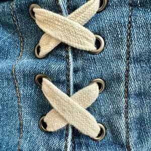 NEW never worn Ocean Drift denim distressed jean shorts with white cream lacing. Features a classic blue color.