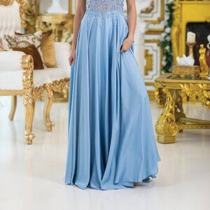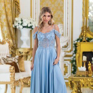 Graceful and timeless, this A-line gown embodies pure sophistication. The round neckline with off-shoulder straps creates a soft, romantic frame, while the sheer bodice adorned with floral lace and rhinestones captures the light with every movement. Perfect for weddings, proms, or formal evenings, it’s a statement of elegance and feminine charm.