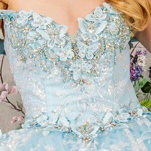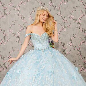 New Off Shoulder Mesh Layered Ball Gown w/ Floral Applique & Lace Up Back GL3183