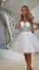 This short white babydoll wedding dress radiates youthful elegance and modern charm. The off-shoulder sweetheart neckline and sheer boned bodice beautifully highlight the figure, while the layered skirt adds a touch of playful volume. Embellished with sequins, it’s a perfect choice for the bride who wants a light, graceful, and unforgettable look.