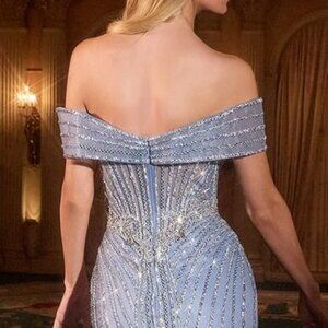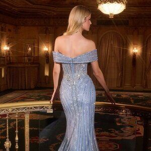 This long tulle sheath gown enchants with a sweetheart neckline and delicate off-shoulder sleeves, creating a graceful feminine allure. Adorned with shimmering rhinestones and intricate beadwork, it captures the essence of timeless elegance.