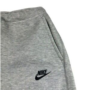 The product is a pair of Men's Nike Tech Fleece Taped Jogger Pants in size 2XL. These activewear pants feature an elastic waist with a drawstring closure, making them ideal for gym training, cross training, and running. The gray color and solid pattern add a stylish touch to the slim-fit jogger style. Made from 53% cotton and 47% polyester, these pants are designed for winter, fall, and spring seasons, and are part of the Nike Tech product line. The tapered leg style gives a modern and athleisure look, perfect for the active man.