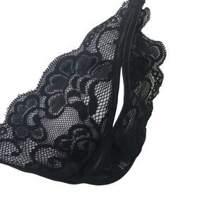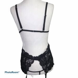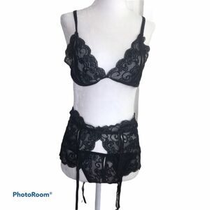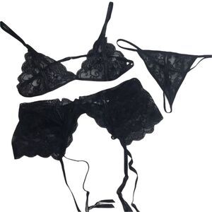 New without tags Oh La La Cheri three piece lace bralette, suspenders, and g-string in black. Back hook and eye closure on bra and suspenders. Adjustable bra straps. Polyamide/Spandex. Size L/XL. Please see size chart in pictures for reference.