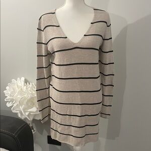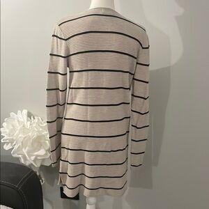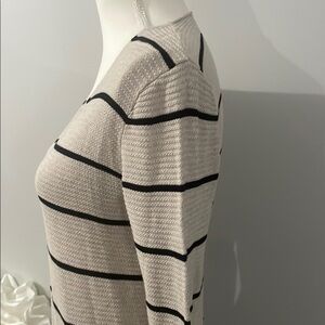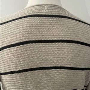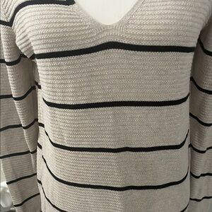 Stylish striped V-neck sweater. Features black and cream stripes.