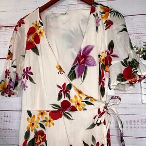 • White wrap dress with floral print, ties at the side, Fully lined, Bell sleeve detailing. Has elastic banding at the waist across the back.