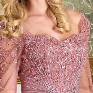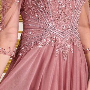 Draped in comfortable Jersey and delicate mesh, this elegant long A-line gown features a bodice richly adorned with dazzling sequins, rhinestones, and beads for a radiant finish. The romantic sweetheart neckline is perfectly complemented by sophisticated sheer 3/4 sleeves, offering beautiful coverage while maintaining an ethereal appeal.