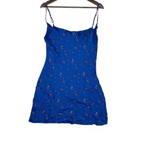 Chic blue dress with floral print. Features spaghetti straps for a stylish look with a slightly draped neckline. A beauty!