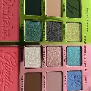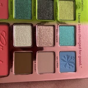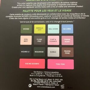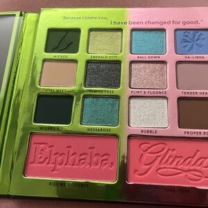 The palette contains 12 eyeshadow shades including Wicked (rich green), Nessarose (vibrant deep teal with blue and green reflects), Ball Gown (medium sky blue with lavender and turquoise reflects), Flirt & Flounce (medium pink with pink, silver, gold reflects),and Bubble (icy white with rainbow reflects). It also contains two cheek colors: one named Glinda and the other Elphaba.
