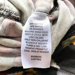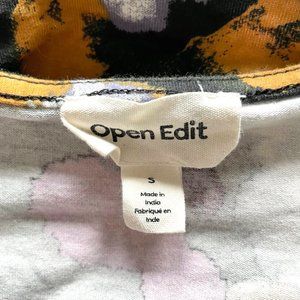 Open Edit Off the Shoulder Ruched Top. A wrapped look and ruched detailing conspire to flatter in this printed cotton-blend knit top with an off-the-shoulder neckline. Pullover. Off-the-shoulder V neckline. Wrap design on the front. Long sleeves with ruched detail. Lightweight knit fabrication. Material: 58% cotton 38% rayon 4% spandex. Abstract pattern in black, grey, white, red, purple, and mustard colors.