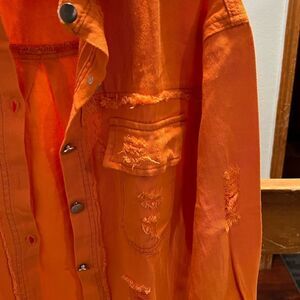 Brand new, from a smoke free home. Denim look, 50% polyester, 50% cotton. Stylish orange button-up shirt. Features distressed details. Perfect for casual wear. Size Small. Great layering piece.