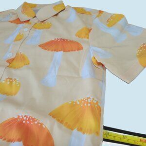 Add a Splash of color to Your Wardrobe! Vibrant colors and playful patterns in this unique vintage-inspired mushroom print shirt. The short-sleeved button-up features a delightful array of orange and yellow mushrooms set against a light background, creating an eye-catching and fun design. Each mushroom is intricately detailed, showcasing realistic gills and stems that add a touch of nature-inspired charm. Perfect for casual outings or themed events, this shirt is sure to make a statement. The classic button-up style offers a versatile look that can be dressed up or down. Whether you’re heading to a summer festival, a casual brunch, or just looking to brighten up your everyday style, this shirt is your go-to choice for a pop of color and personality. [Brand New/Never Worn]