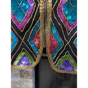 Ideal for parties, plays, and formal occasions, this jacket is handmade and crafted with care. The beaded embroidery and sequin details are perfect for adding a pop of color and sparkle to your outfit. This jacket is a size medium and should be dry cleaned only. Don't miss out on this unique and beautiful piece of evening wear.