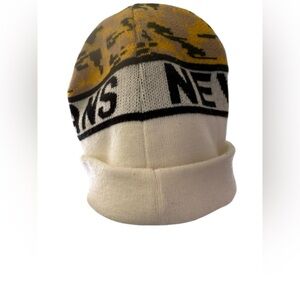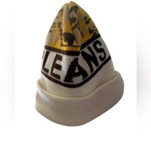 Stylish knit beanie featuring 'New Orleans' text and a fleur-de-lis emblem. Yellow, brown, and cream colors. Unisex. Stain on inside (pic included) but does show through beanie. Inside tag is not readable. SFPF HOME.
