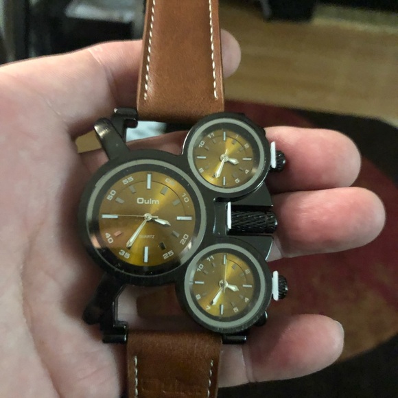 New Oulm watch featuring three dials. Brown strap with black casing. Unique design for versatile style.