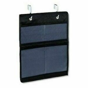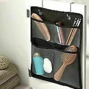 Hangs on cabinet doors to store personal items such as brushes or cosmetics
