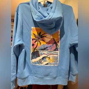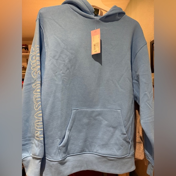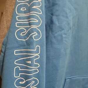 Comfortable blue hoodie with 'Coastal Surf' text on the sleeve. Features a front pocket.