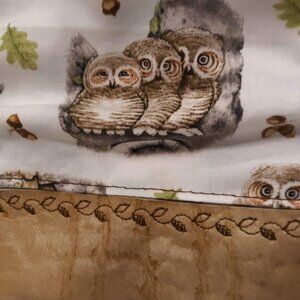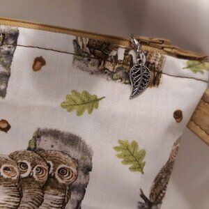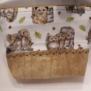 This handmade wristlet clutch style make-up bag features a fun owls theme fabric.