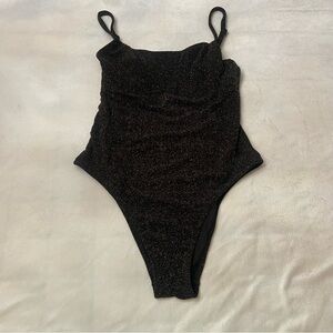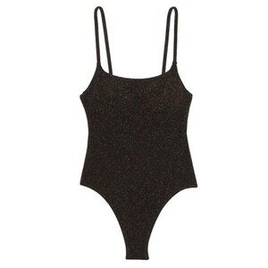 This sleek black one-piece swimsuit from PINK Victoria's Secret features thin spaghetti straps and a high-cut leg line for a flattering silhouette. The slightly textured fabric adds a touch of elegance, while the straight or slightly sweetheart neckline enhances its timeless appeal.