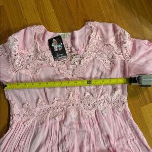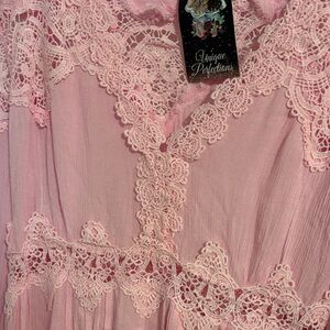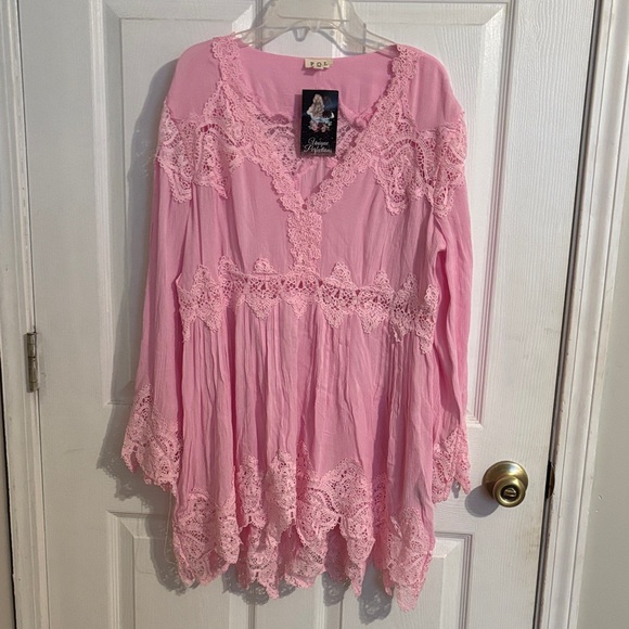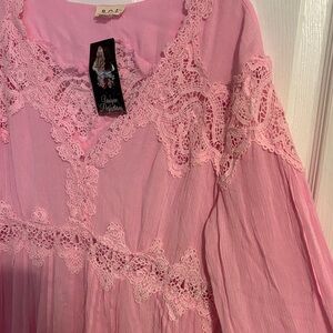 New POL Candy Pink Lace Trim Tunic Top-Medium. Dressed up lace floaty top . Elegant pink tunic with lace trim. Perfect for a chic look.