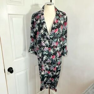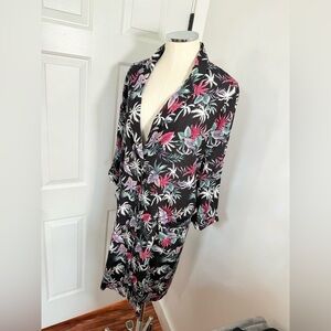 Elegant floral print mid length jacket /duster perfect for lounging or you can dress it up in style. Features a beautiful blend of tropical colors against a black background. Two front pockets and a button down front