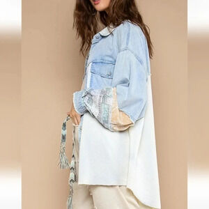 New! POL Oversized Contrast Ivory Denim Fabric Panels Button Down Lightweight Shacket Shirt Jacket by Boutique brand Pol which is carried by fine retailers like Anthropologie and Nordstrom.