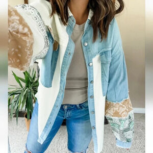 New! POL Oversized Contrast Denim Ivory Fabric Panels Button Down Shacket S