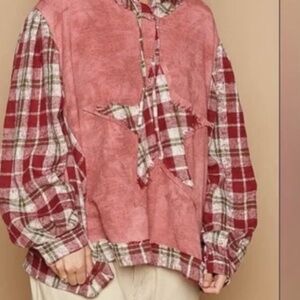 New POL Star Patch Plaid Flannel Long Sleeve Hooded Top Hoodie