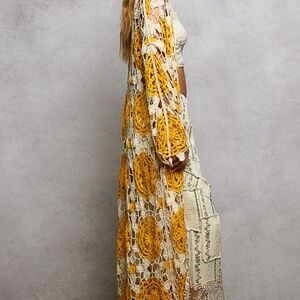 Eye-catching crochet knit cardigan in a vibrant blue and ivory floral design. This duster-style features a colorful mix of yellow and cream hues, perfect for adding a bohemian flair to any outfit. The open-front design and long sleeves make it a comfortable and stylish layering piece. Ideal for music festivals, casual outings, or adding a pop of color to your everyday wardrobe.