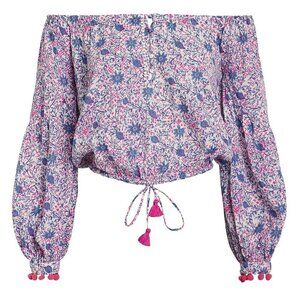 Signature tassel and pom-pom accents further the boho-chic allure of this floral crop top. Elasticized off shoulder.