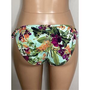 Pilyq print with purple iris, white orchids, orange and yellow flowers with green foliage on a teal background.