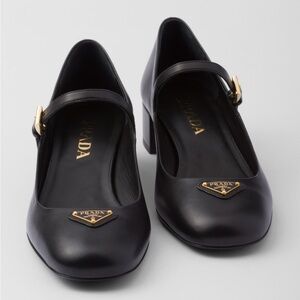These Prada ballerina pumps are crafted of napa leather and feature a round toe, a 1.38 in / 35 mm block heel, and a Mary Jane buckled strap. The design is finished with the brand's signature triangle logo accent and a leather outsole. Made in Italy