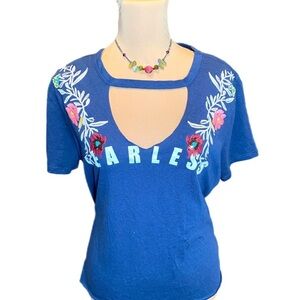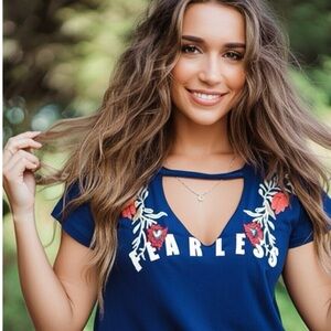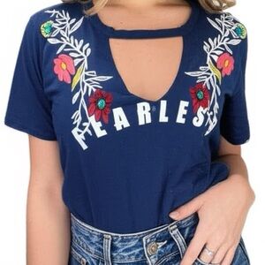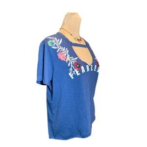 New PROJECT 28 Shirt Women’s FEARLESS Sz Large Blue Embroidered Floral Boho Top