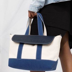 New...not used...authentic 15" w x 8.3" h x 5.3" d - Blue Calf leather and canvas beach tote Embossed logo flap loops through handles Flat top straps One main compartment Made in Italy Dust bag