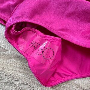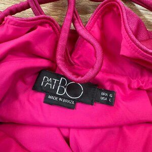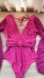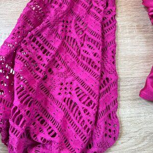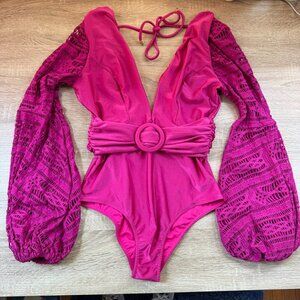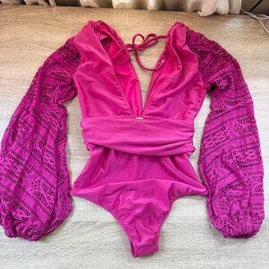 New PatBo Crochet Long Sleeve Plunge One Piece Swimsuit Swim V Neck Pink Magenta